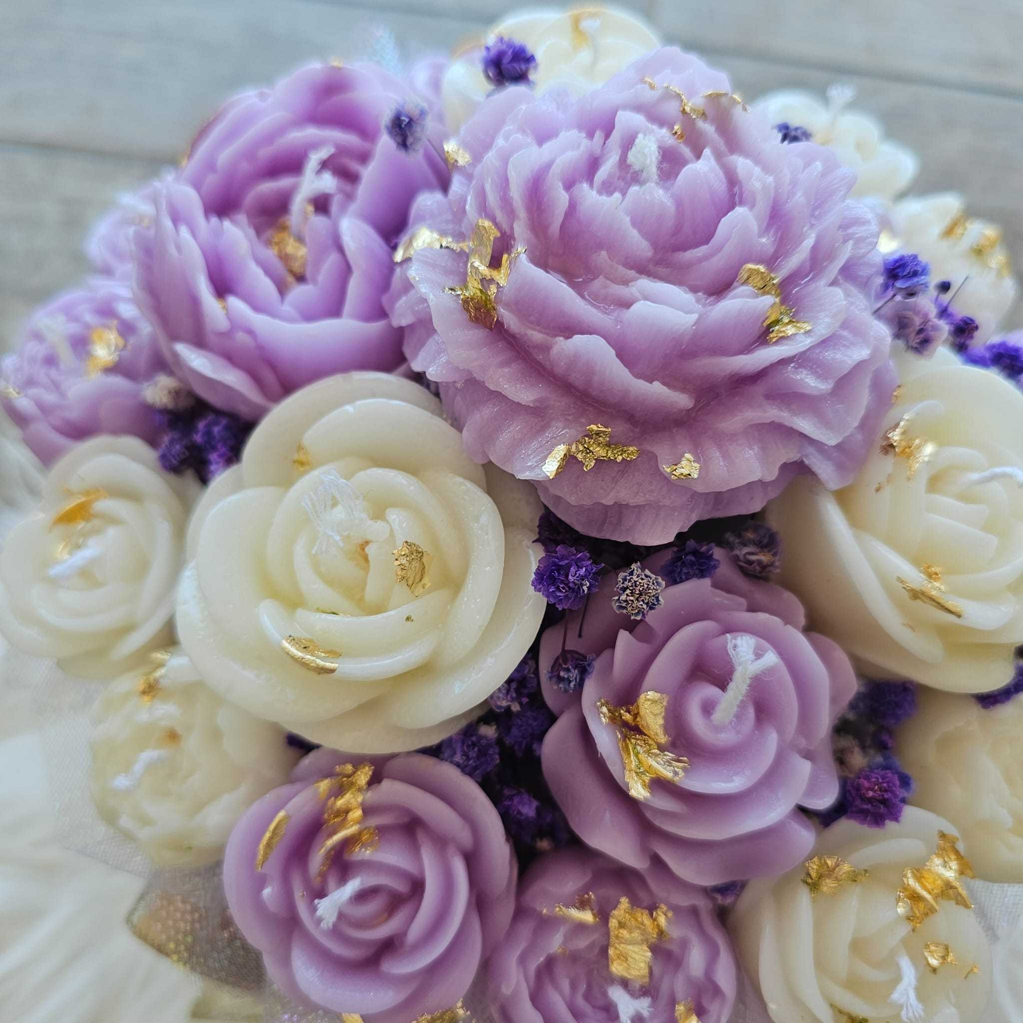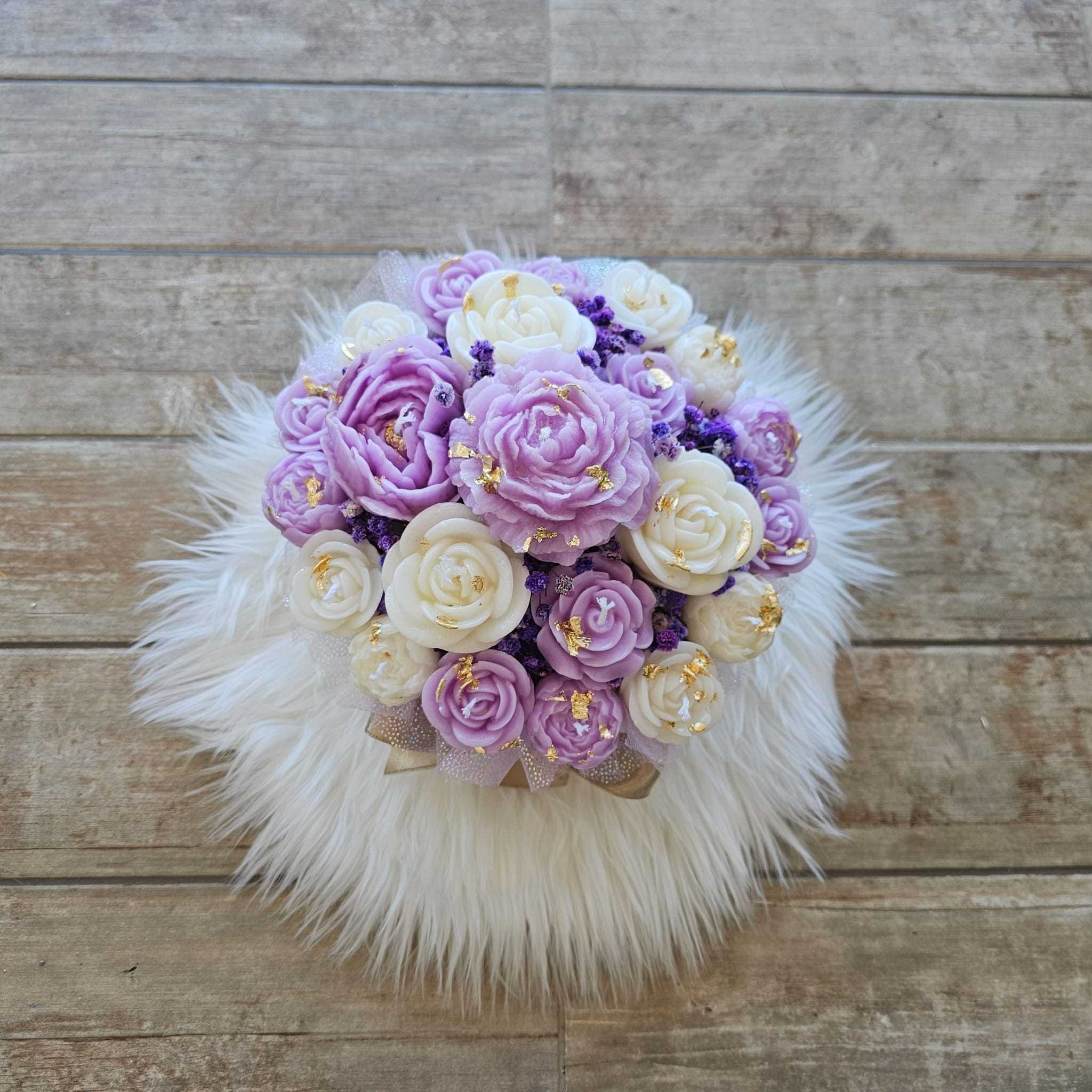 ✨ זר פרחי נרות בעבודת יד בגווני לילך–שמנת עם עלי זהב, מגיע בקופסה עגולה איכותית – מתנה יוקרתית, ריחנית ומרגשת לכל אירוע. ✨