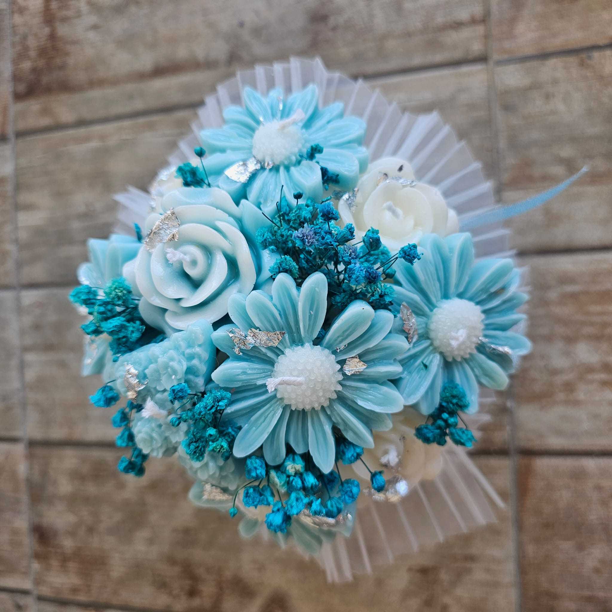 זר אלגנטי, מרגיע ויוקרתי בעבודת יד, המשלב פרחי נר מפוסלים בצבעי תכלת רך ושמנת, יחד עם פרחים יבשים בגווני טורקיז ועלי כסף עדינים שמוסיפים מראה יוקרתי.