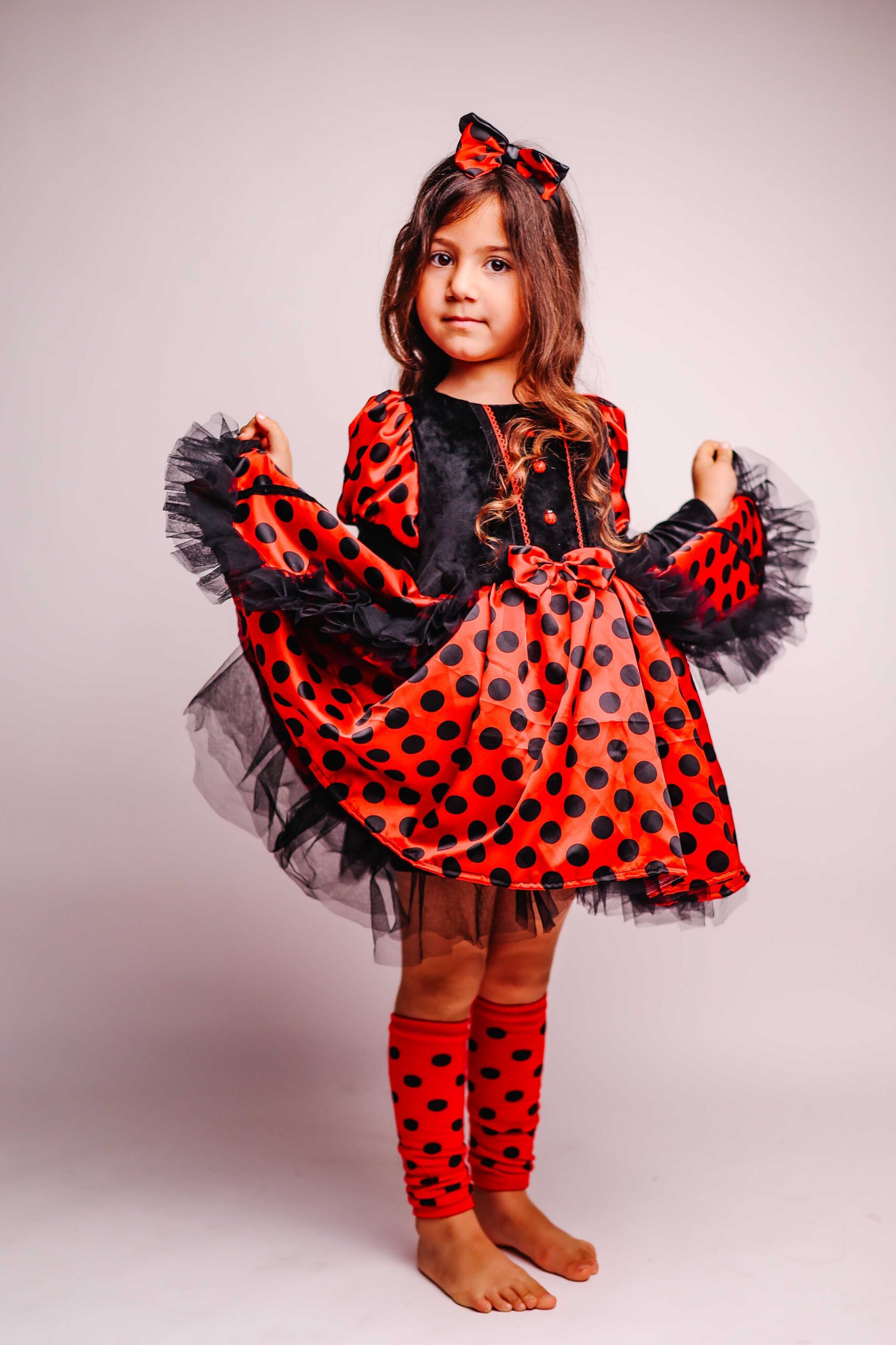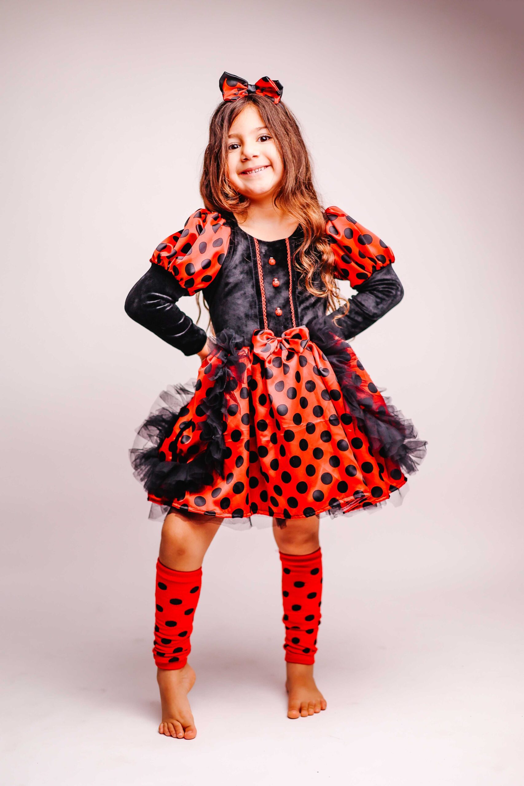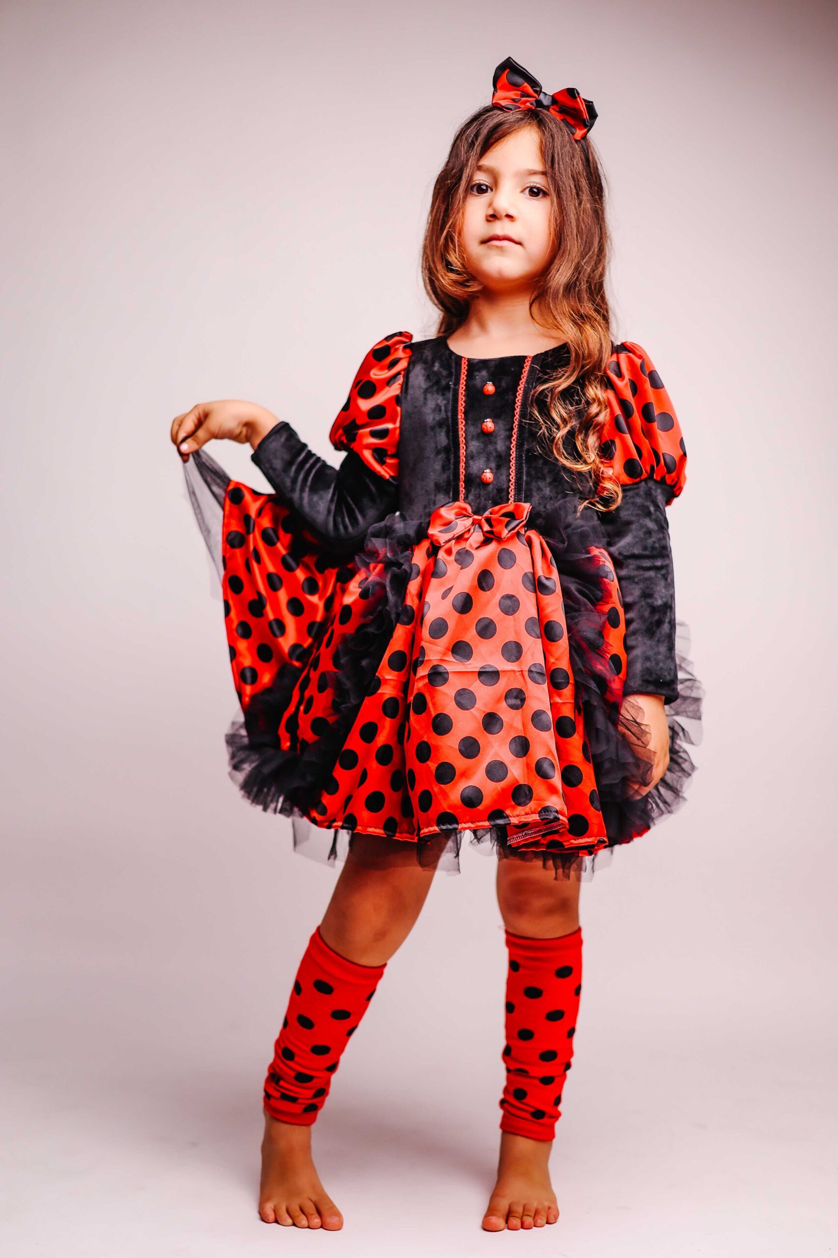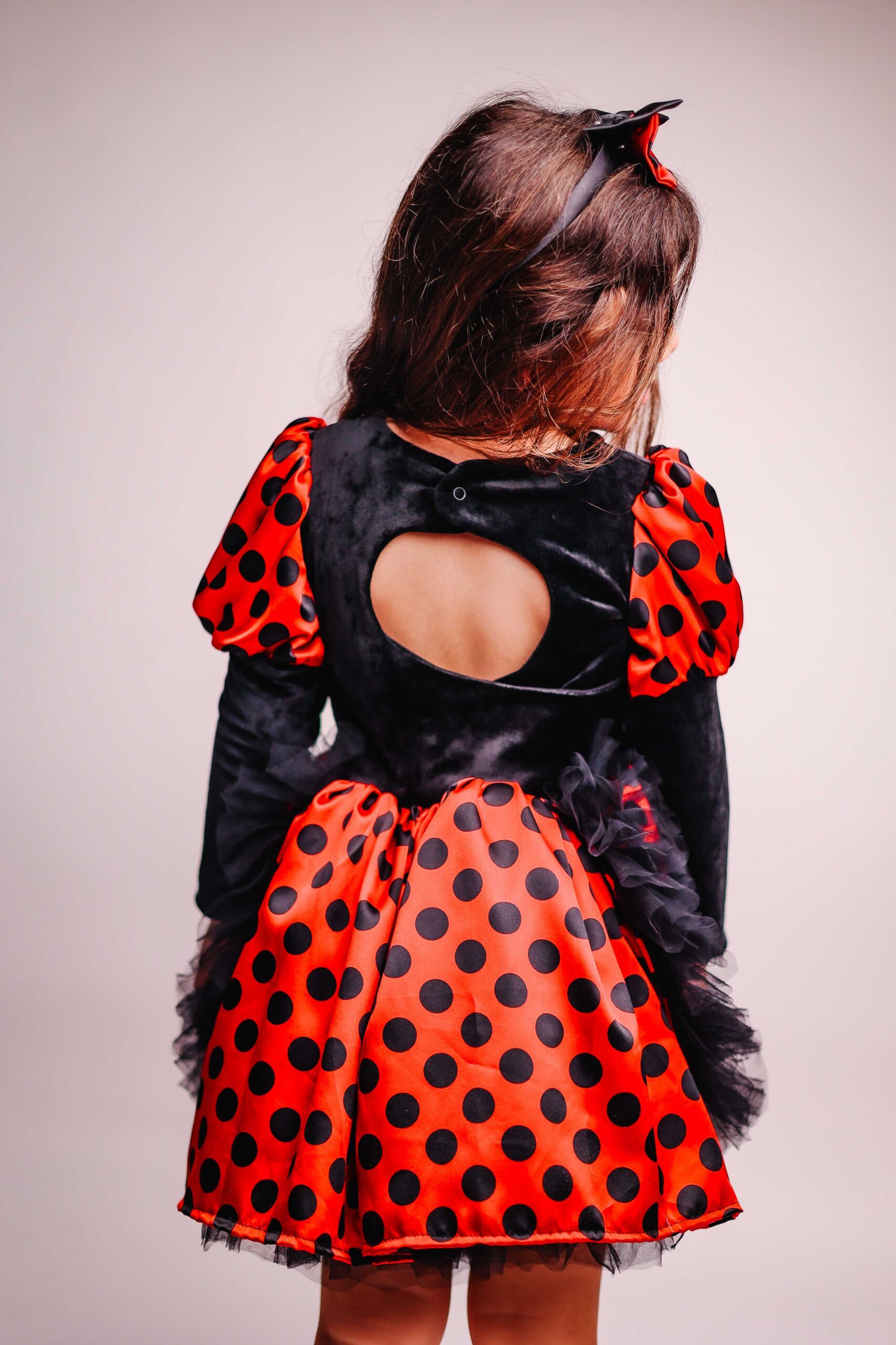 כל פרט בתחפושת יוצר תחושה של קסם טבעי. האדום העז, הנקודות השחורות, החלק השחור המקטיפתי, שכבות הטול השחורות והקשת עם האוזניים – הכל ביחד יוצר את המראה המושלם של חיפושית קסומה. זו תחפושת שתגרום לחיוכים רחבים, למחמאות, ולכל רגע להיות קסום ומיוחד.