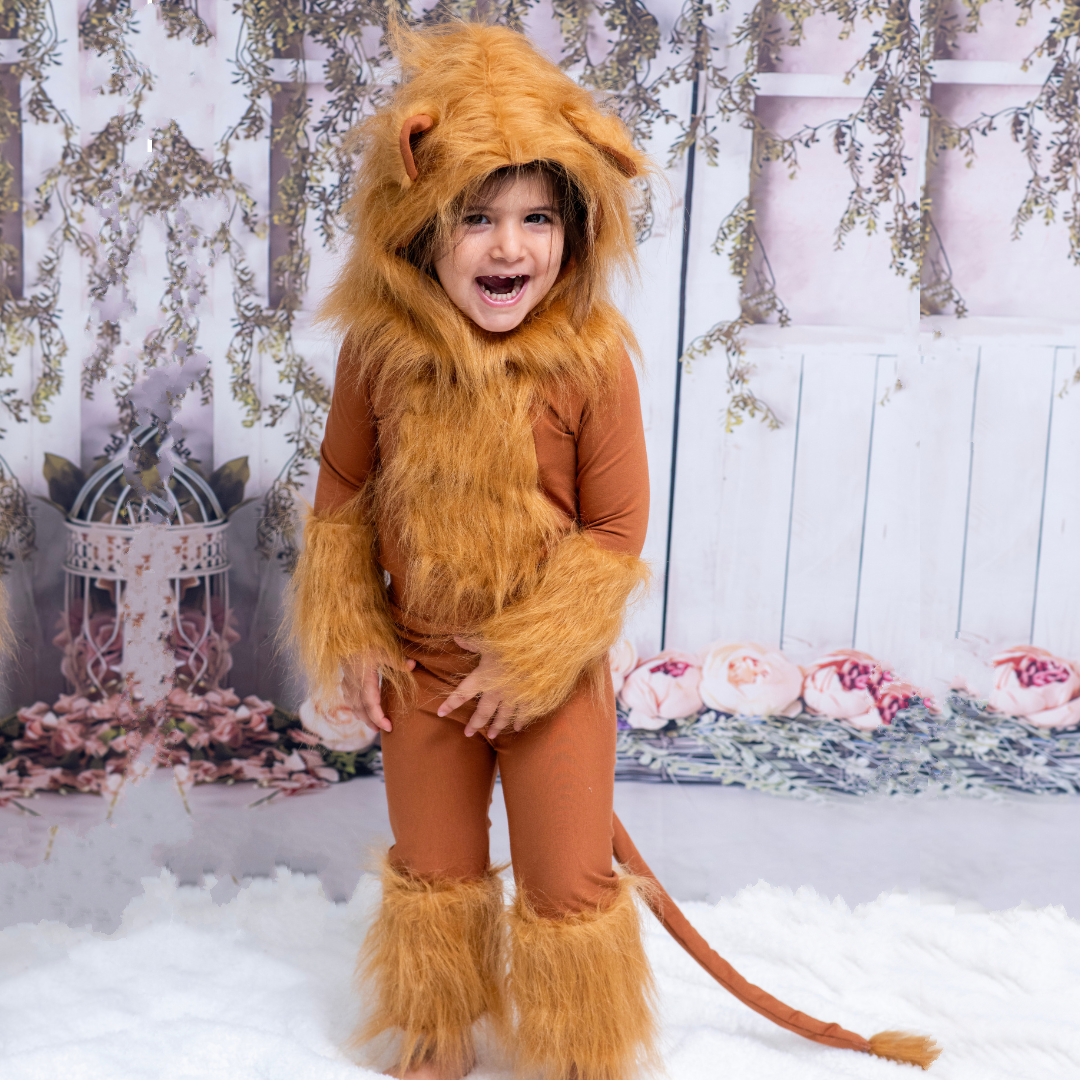 התחפושת כוללת בגד גוף, מכנסיים וזנב תואם – עם כובע פרוותי מדהים שמדגיש את רעמת האריה.