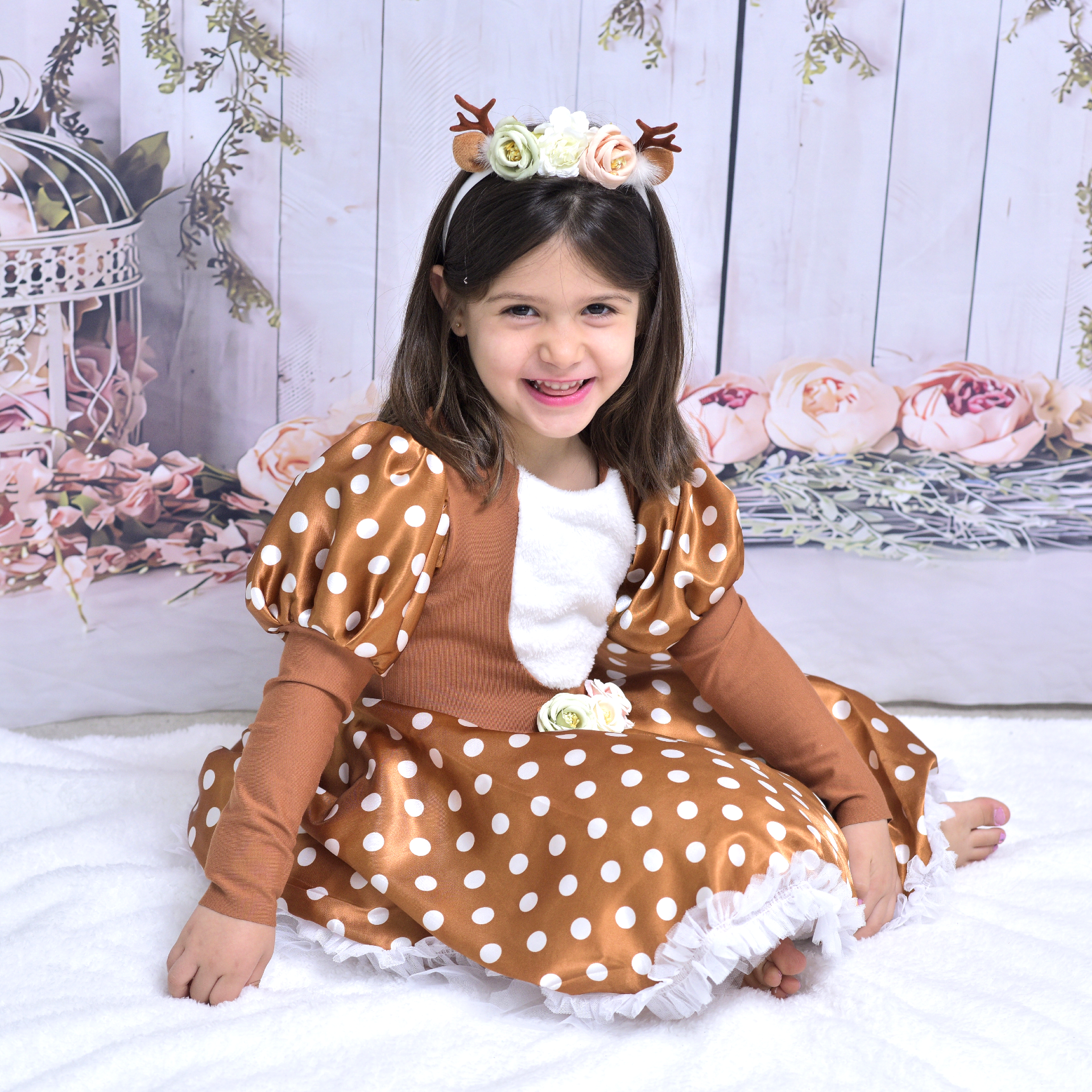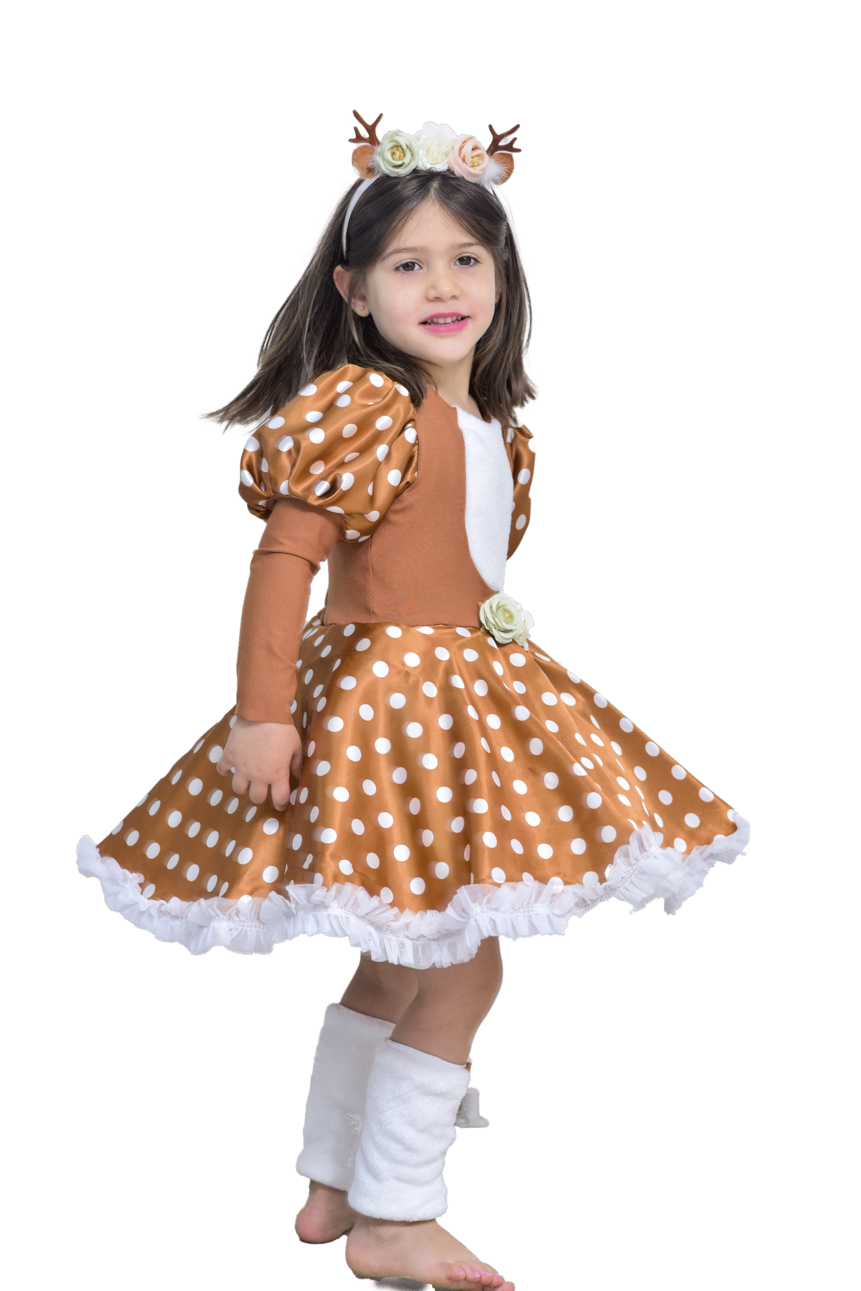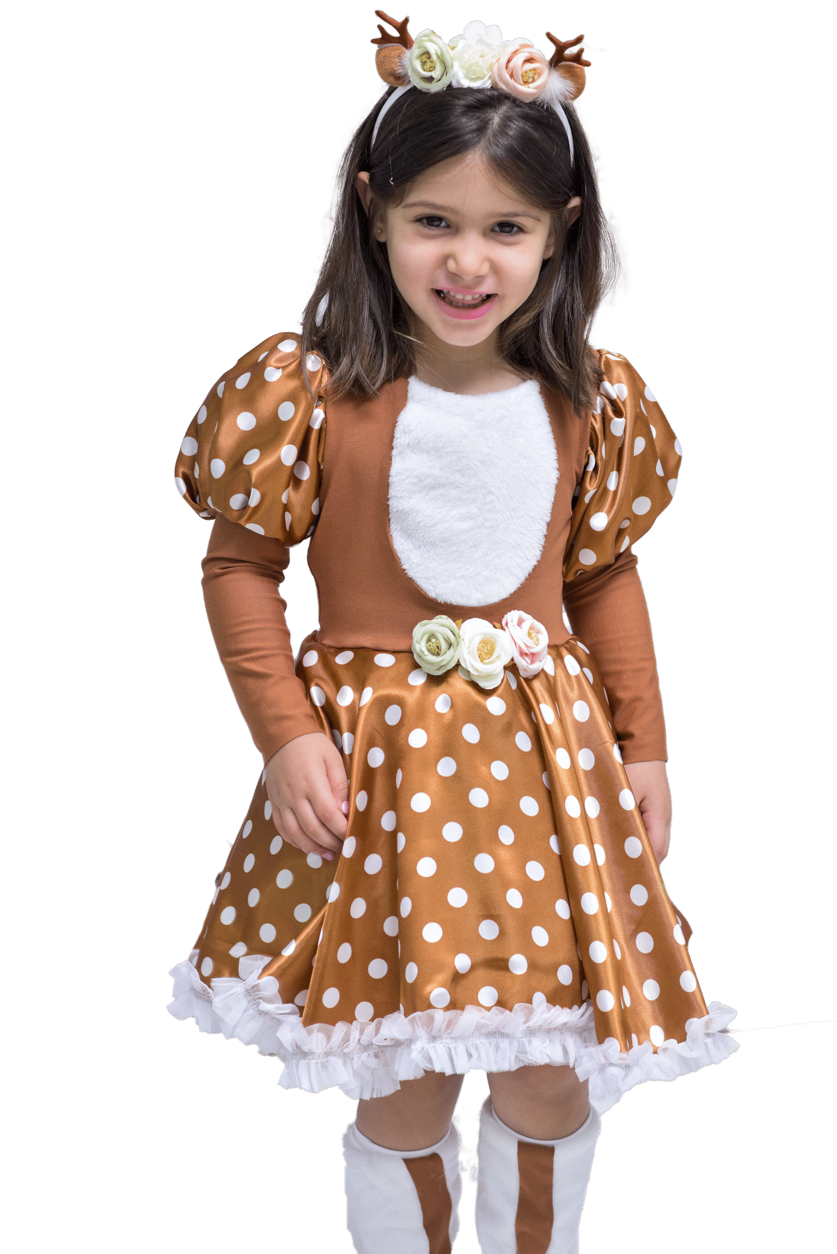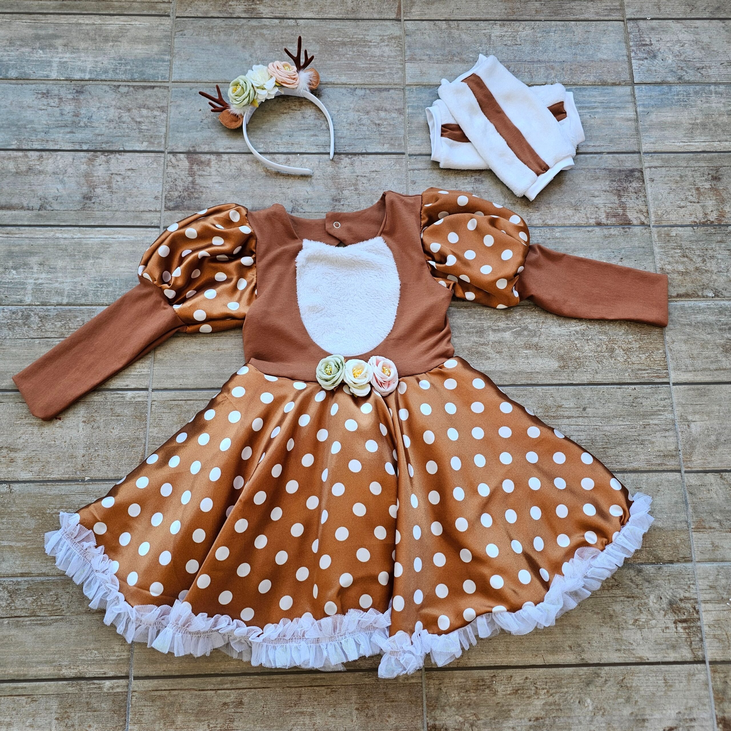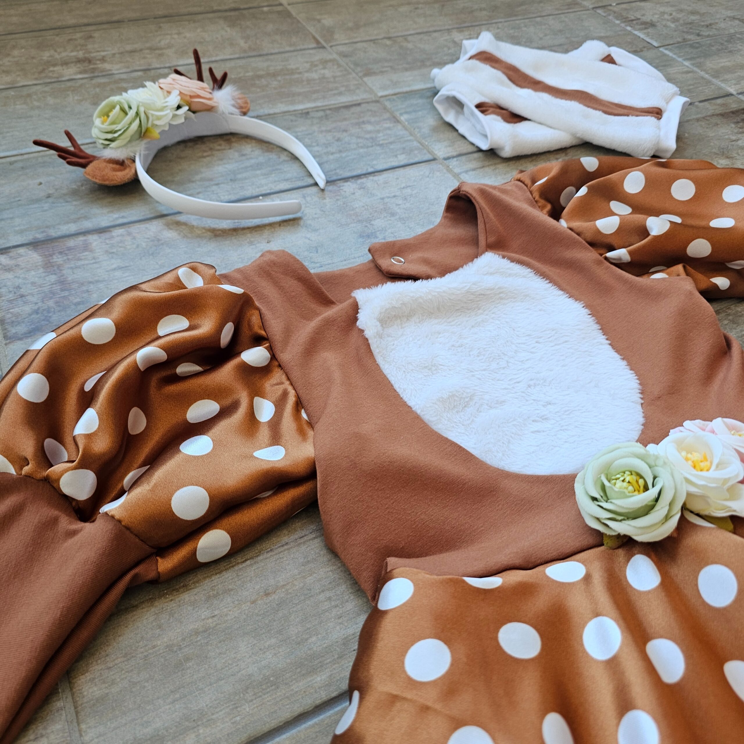 תחפושת צבי עדינה וחמודה 🦌 חום רך עם נקודות לבנות, קשת עם אוזניים וחותלות שמשלימות את הקסם