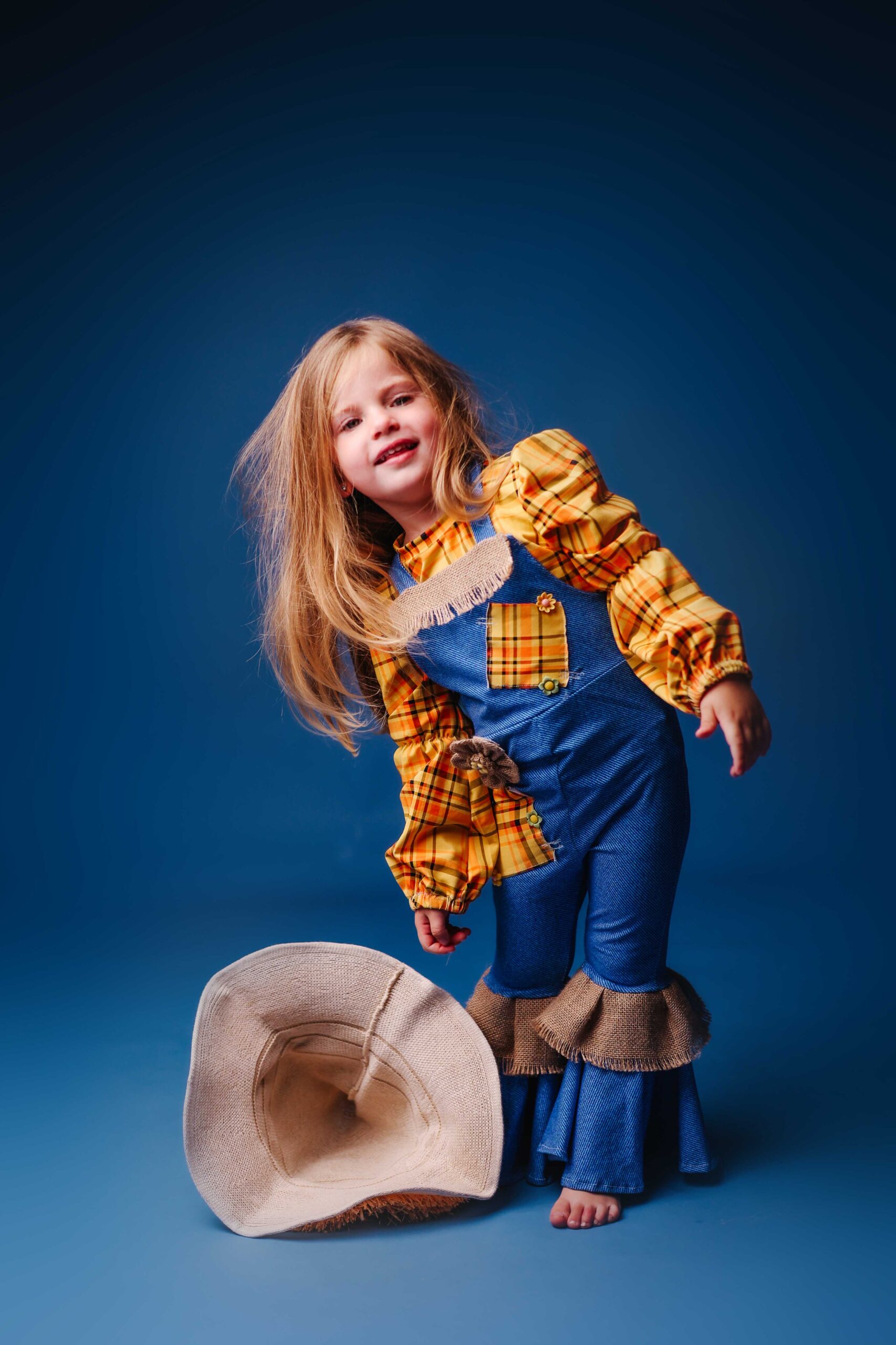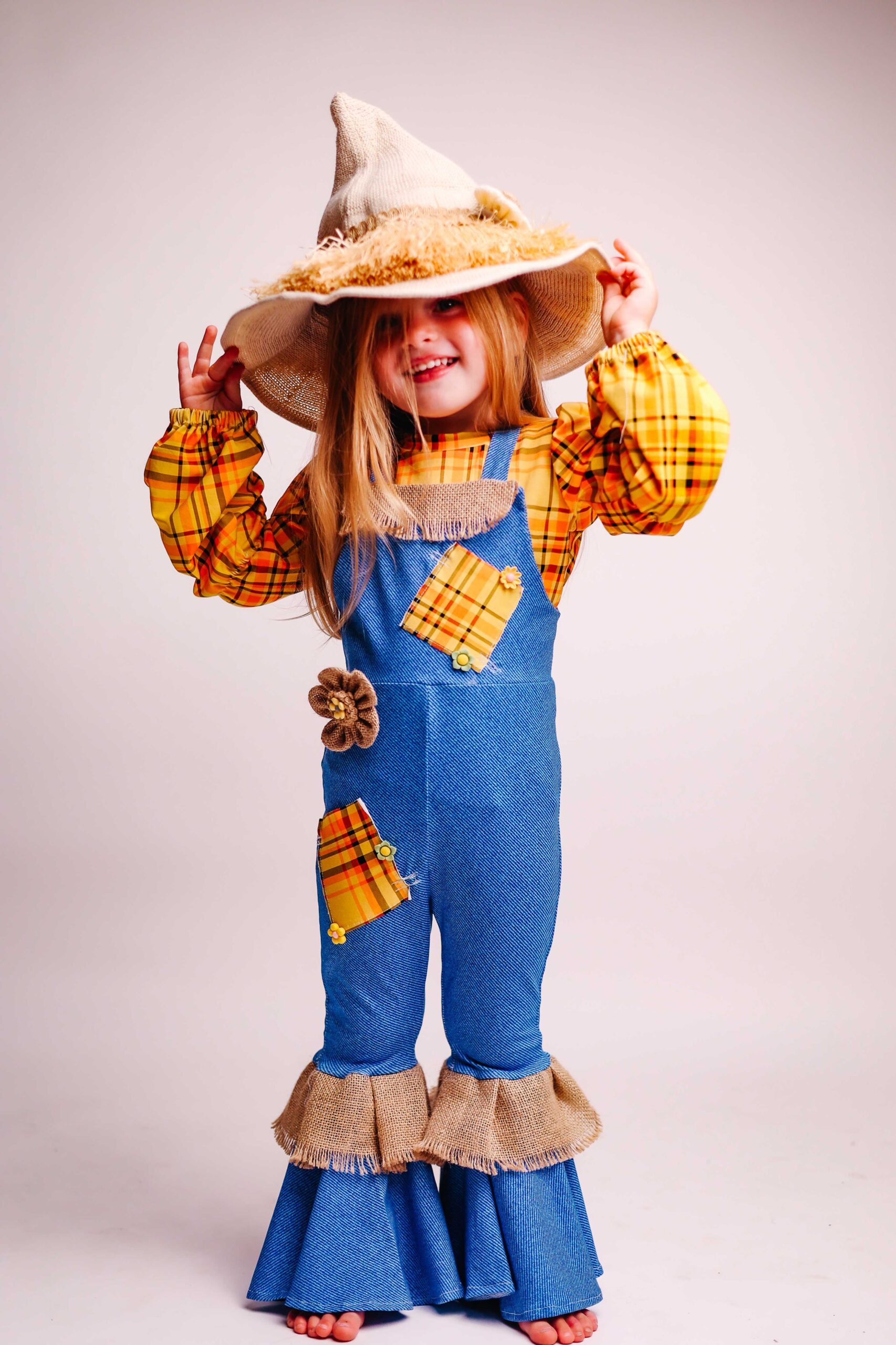 האוברול בגוון כחול ג’ינס מעוצב עם טלאים צבעוניים, פרטים מבד יוטה המדמים קש, וחולצה משובצת בגווני צהוב כתום להשלמת המראה הכפרי.