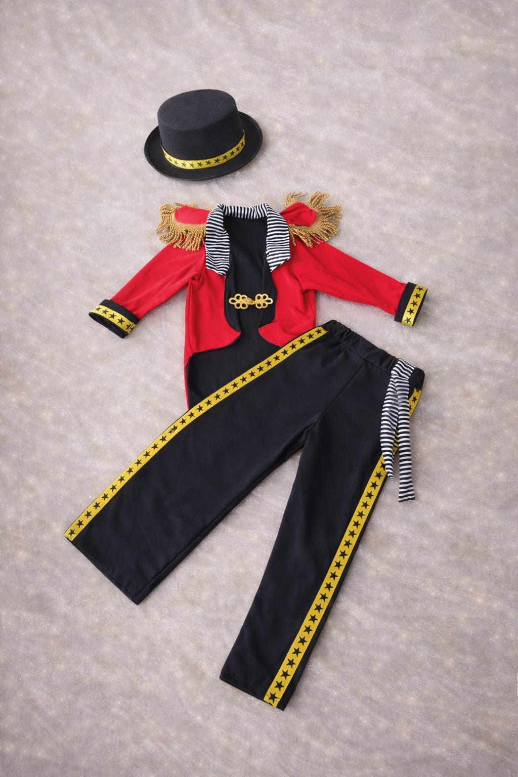 תחפושת דרמטית ומלאת נוכחות שמכניסה כל ילד ישר למרכז הזירה. שילוב הצבעים האייקוני של אדום, שחור וזהב יוצר מראה מרשים של מאלף אריות אמיתי, כזה שמושך מבטים ומעורר דמיון. הפרטים הקטנים – הסרטים, העיטורים והכובע – יוצרים תחושה של מופע קרקס חגיגי, עוצמתי ומלא ביטחון. זו תחפושת שגורמת לילד להרגיש מנהיג, בטוח בעצמו, ועם חיוך של “ההצגה מתחילה”.
