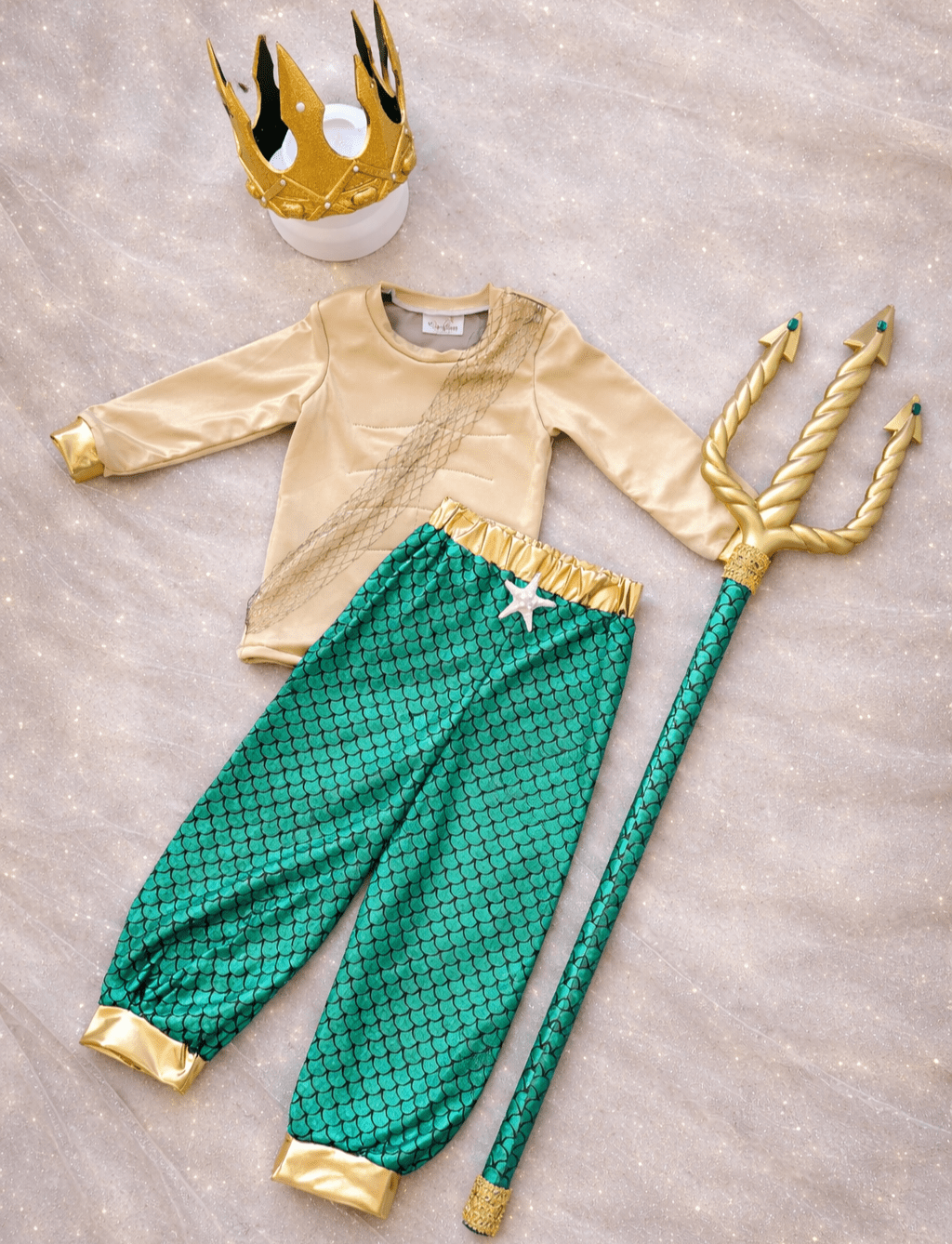 תחפושת מרשימה שמכניסה כל ילד לדמות של שליט הים האגדי. שילוב צבעי זהב וירוק-טורקיז יוצר מראה עשיר ומלכותי, בד קשקשים מנצנץ מדגיש את עולם המים, והכתר והקלשון משלימים לוק דרמטי ומלא נוכחות. זו תחפושת שמרגישה נוחה על הגוף – אבל נראית כמו אגדה חיה.