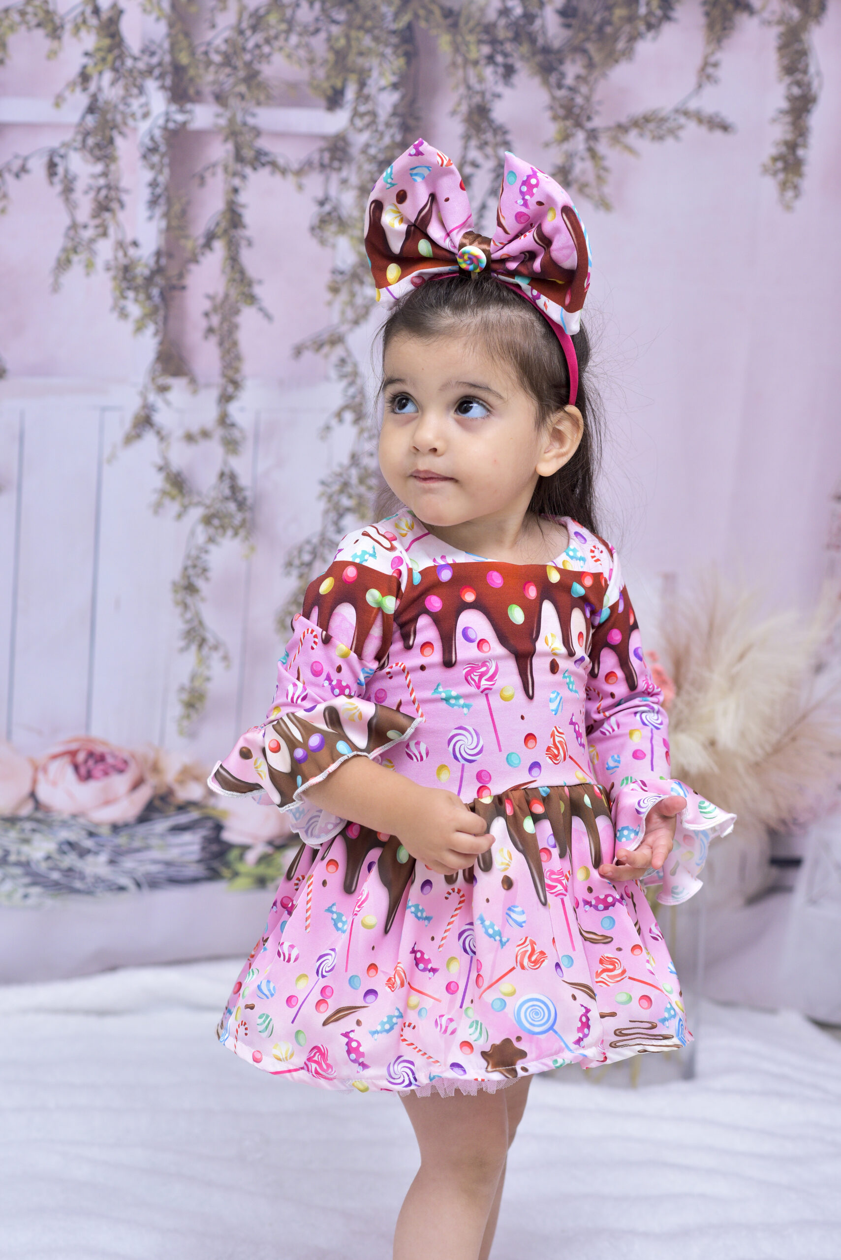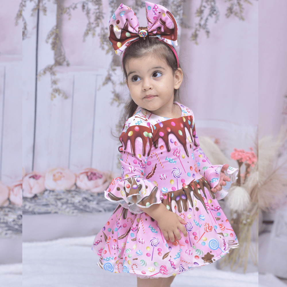 השמלה מעוצבת בהשראת עולם הממתקים הקסום, עם הדפסי סוכריות, שוקולד וצבעים עליזים שגורמים לכל חגיגה להפוך למסיבת מתוק אמיתית.