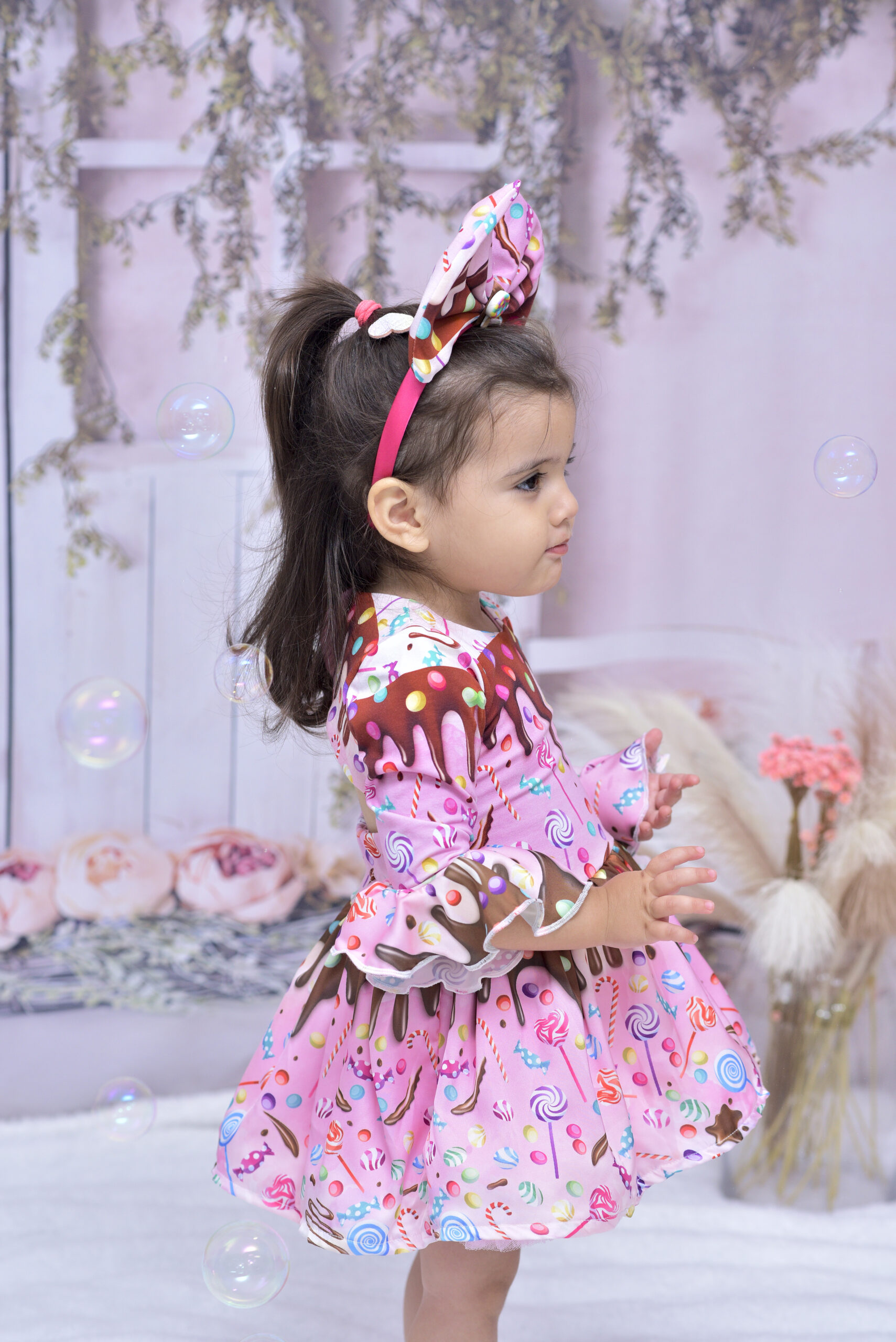 מתוקה כמו סוכריה 🍭 שמלה בורודה מתוקה עם דוגמאות ממתקים צבעוניות וקשת ענקית שהופכת כל ילדה לממתק הכי חמוד