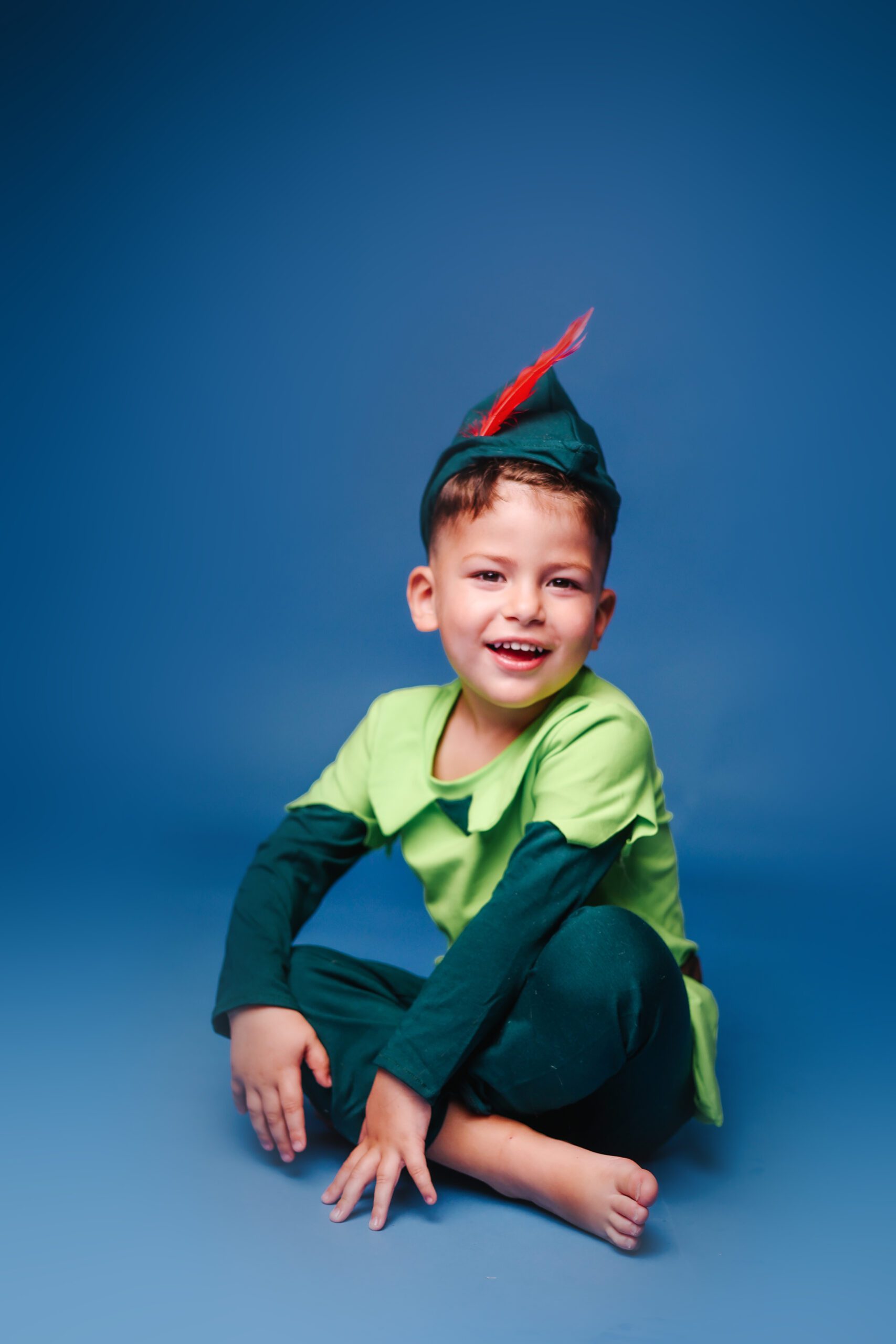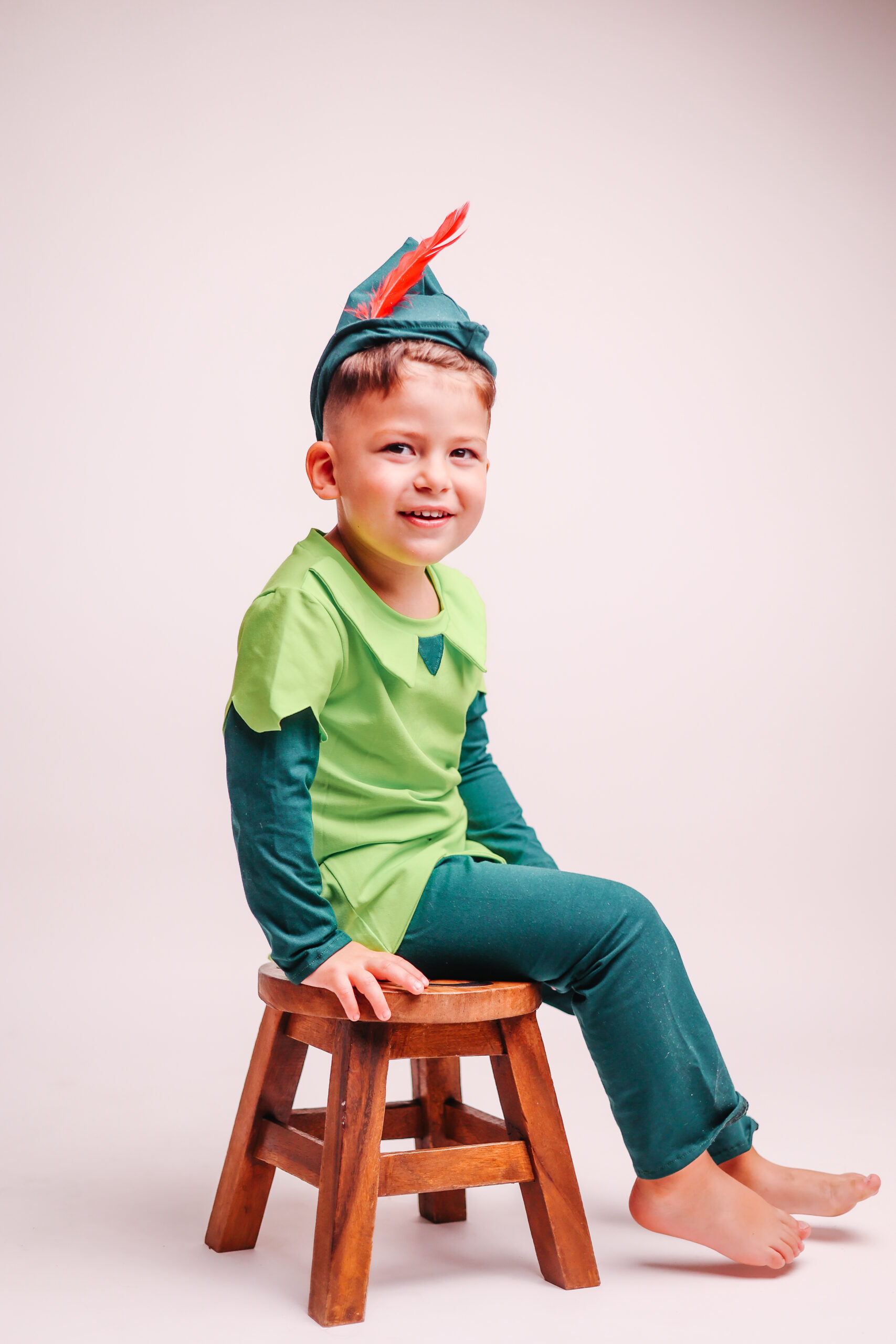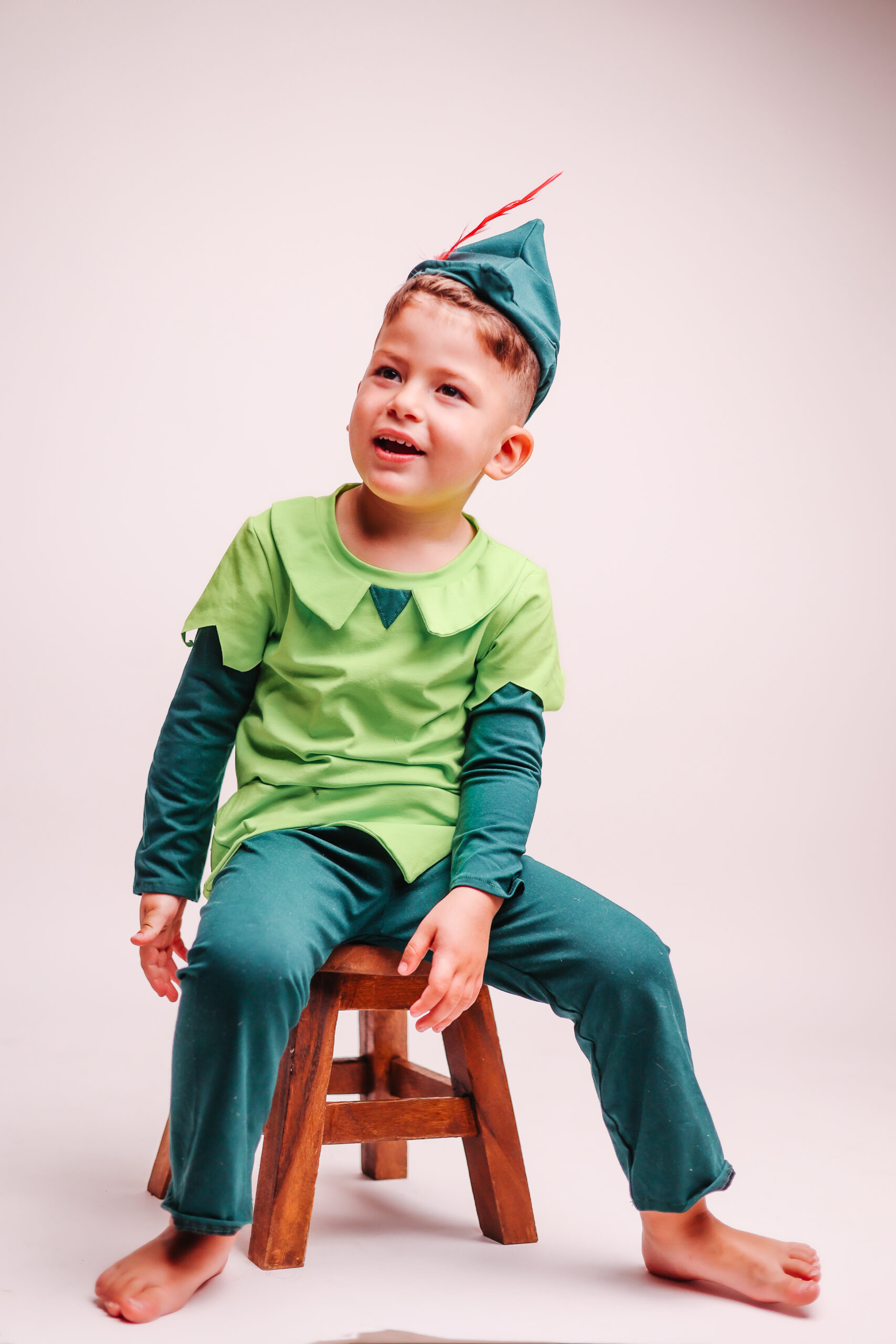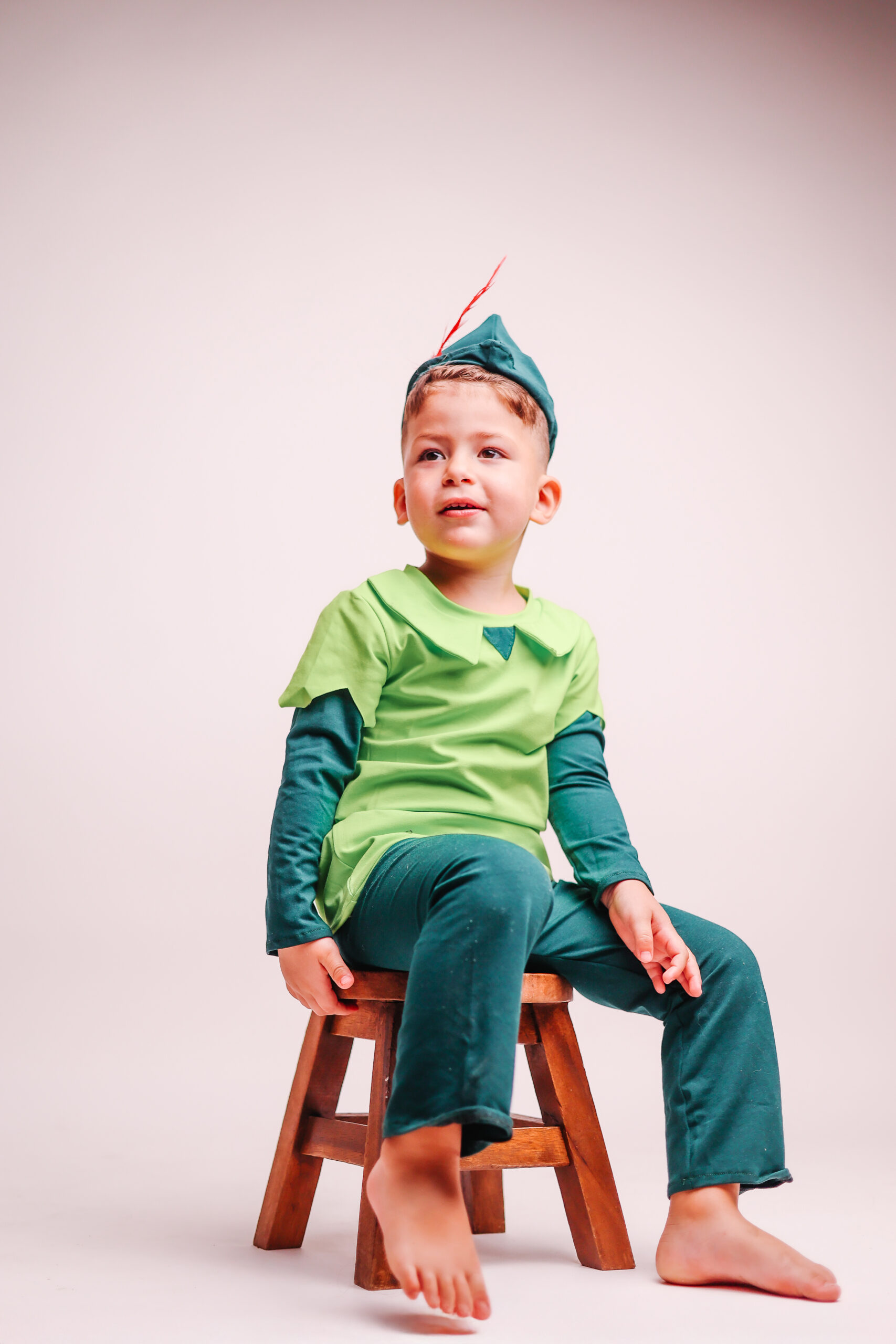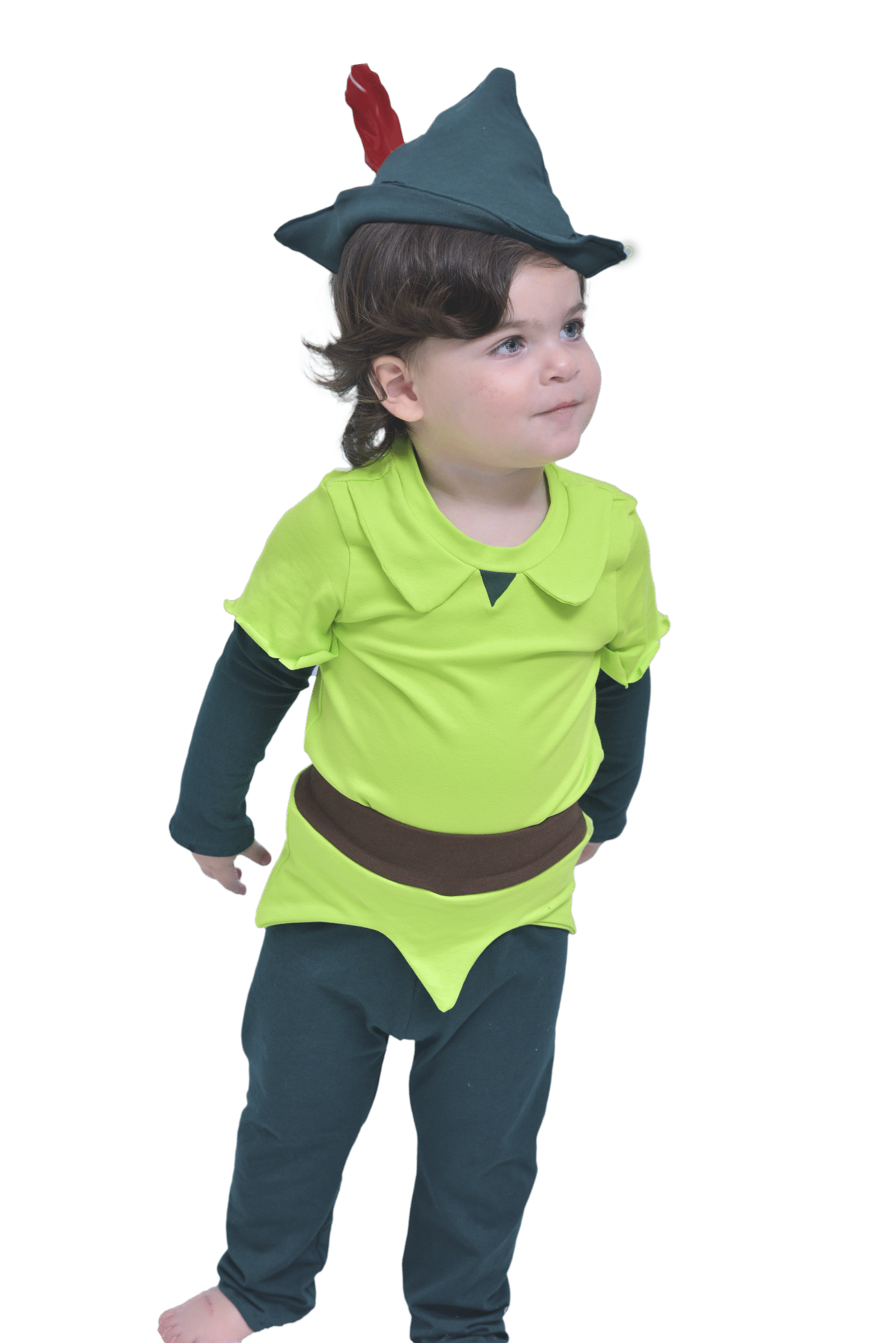 תחפושת פיטר פן לילדים בעבודת יד – עיצוב קסום ונוח מבד כותנה רך עם חולצה ירוקה, מכנסיים וכובע עם נוצה.