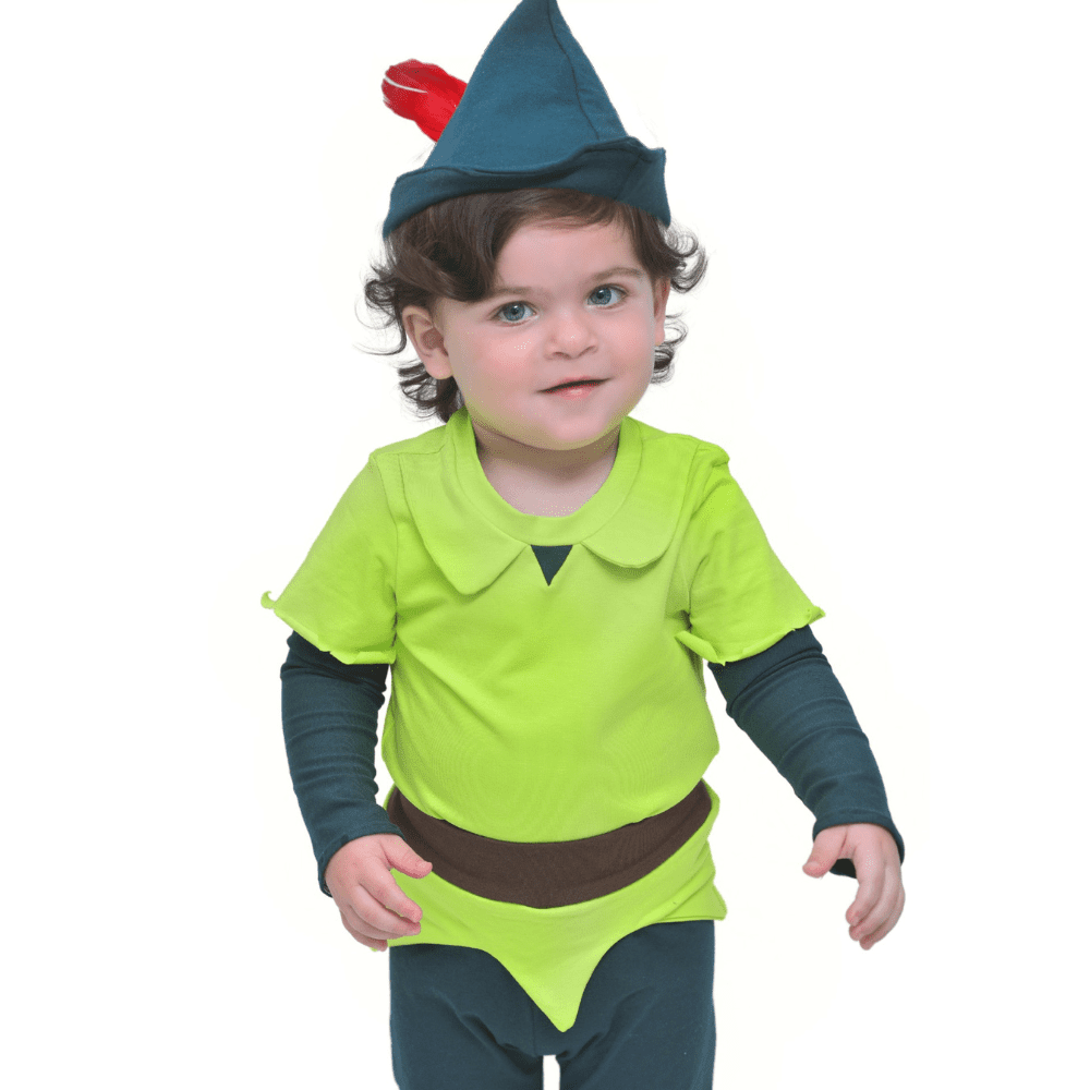 התחפושת שתכניס את הילד שלכם לארץ לעולם-לא! עשויה מבד כותנה איכותי, כוללת חולצה ירוקה עם שוליים מחודדים, מכנסיים תואמים וכובע עם נוצה אדומה.